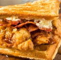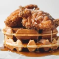 Crispy Fried Chicken Thigh + Golden Belgian Waffle + Maple Butter + House Hot Honey Drizzle – Add Egg -$3