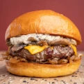Beef smash patty + crispy bacon + beer cheese sauce + fried onions + mustard mayo + pickles + brioche