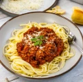 Slow-Simmered Beef Ragu + Spaghetti Pasta + Garlic Tomato Sauce + Parmesan Cheese + Fresh Herbs + Garlic Toast