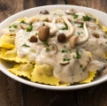 White base with garlic cream + roasted cremini mushrooms + mozzarella + truffle oil + parmesan and arugula